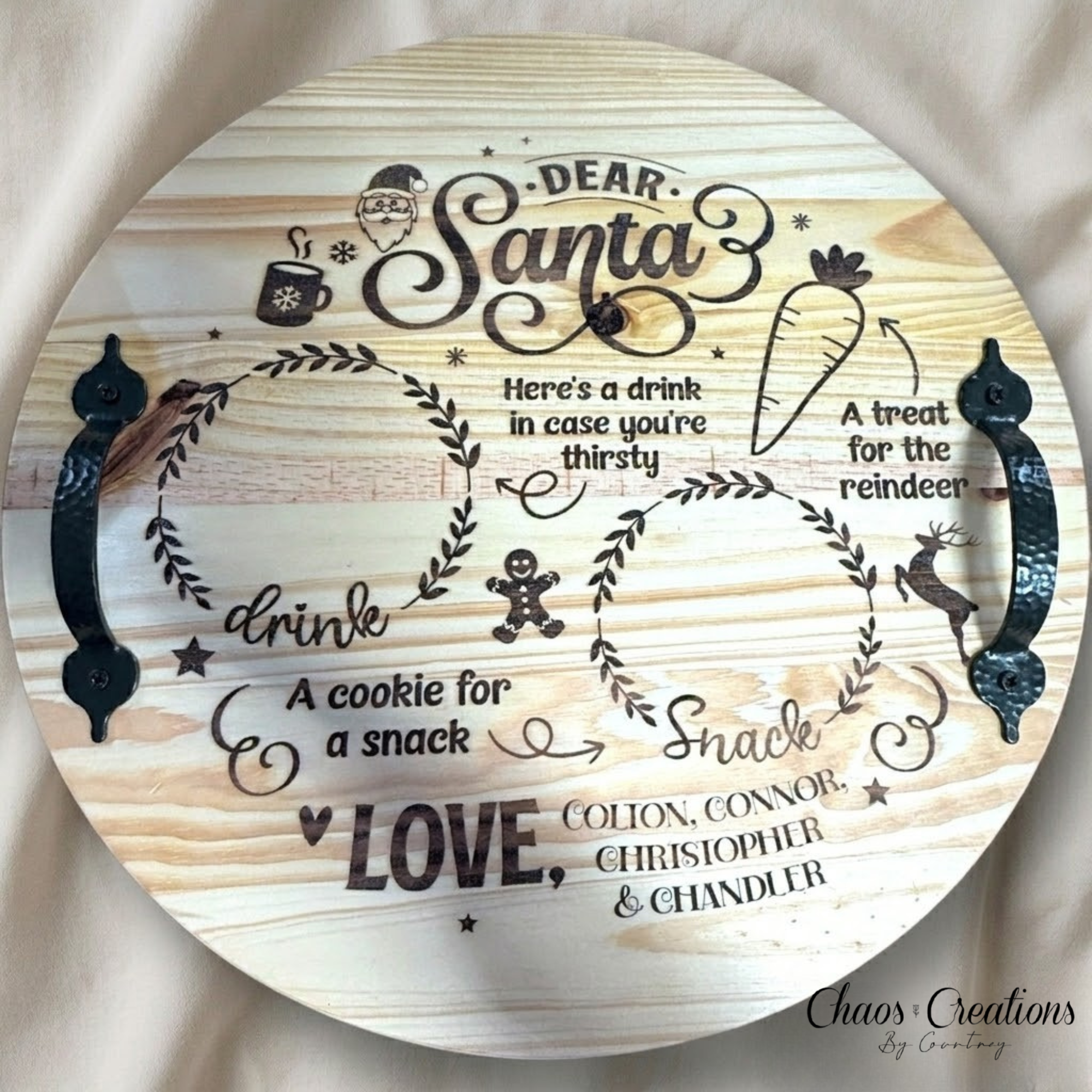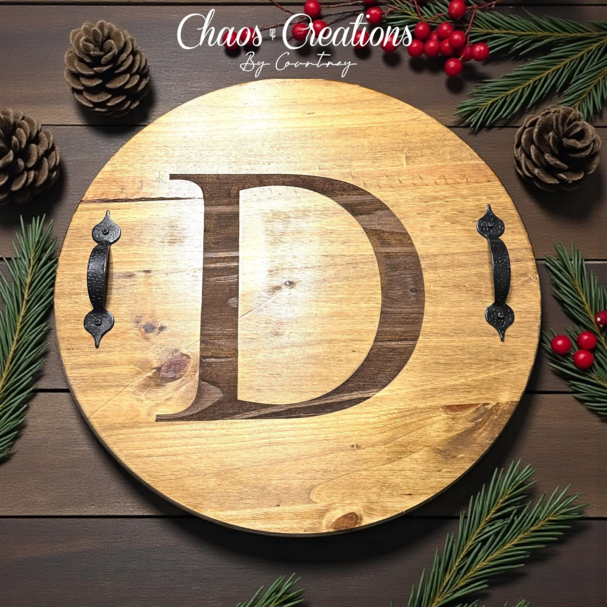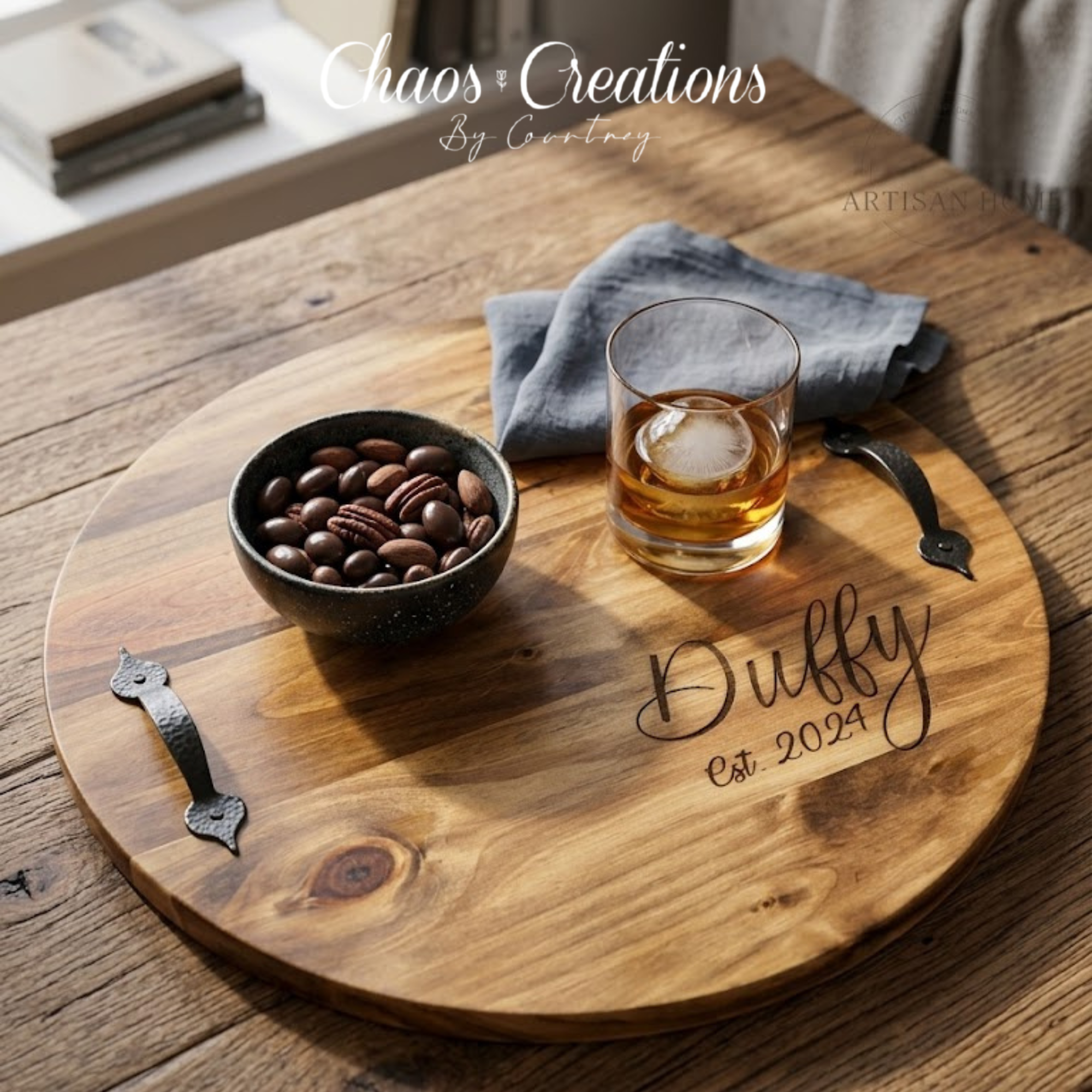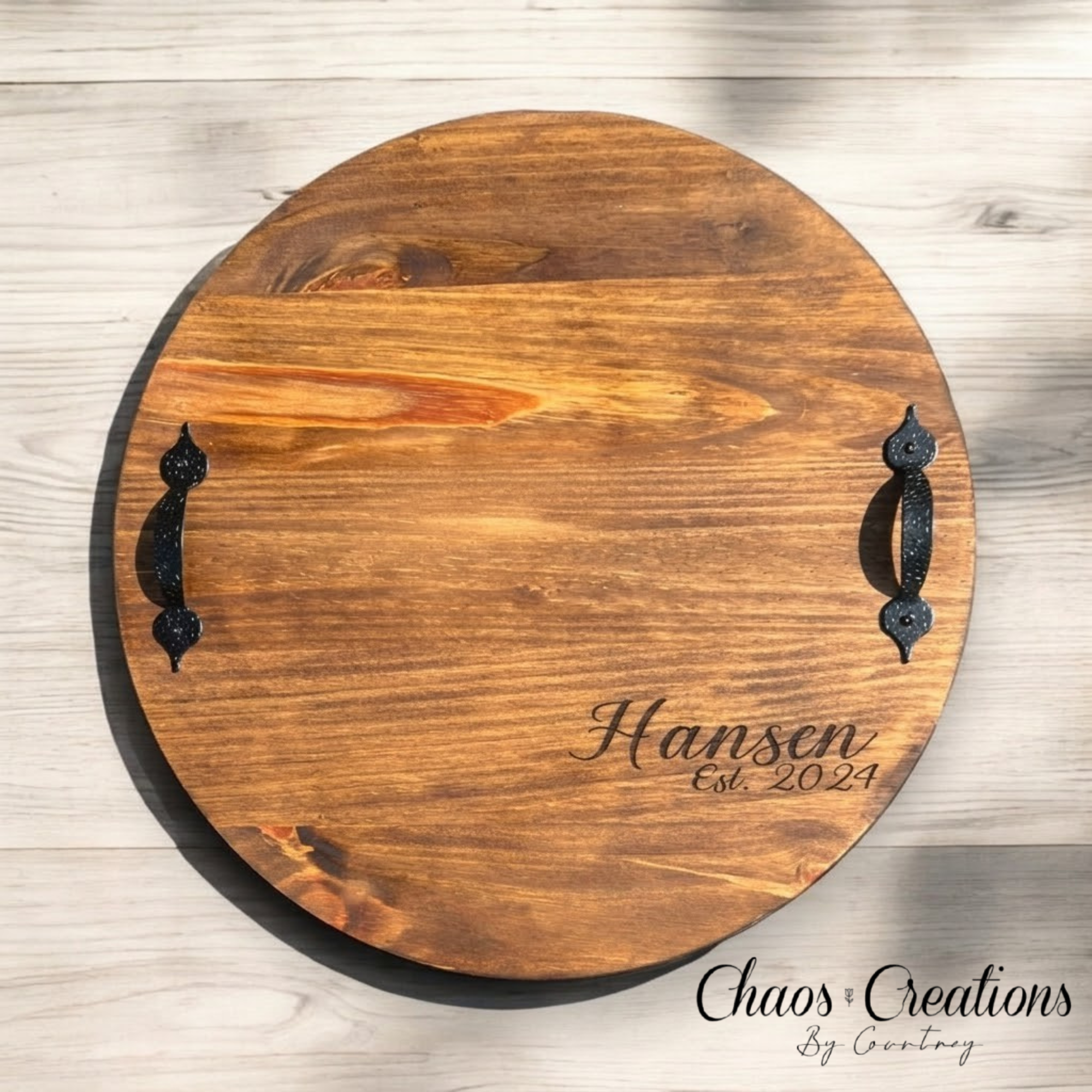 Each tray is made from a solid pine round, carefully sanded smooth, stained for a rich finish, and sealed with a protective poly coat for durability and long-lasting use. Your custom design is then laser engraved in-house, creating a permanent, high-end look that won’t fade or peel.