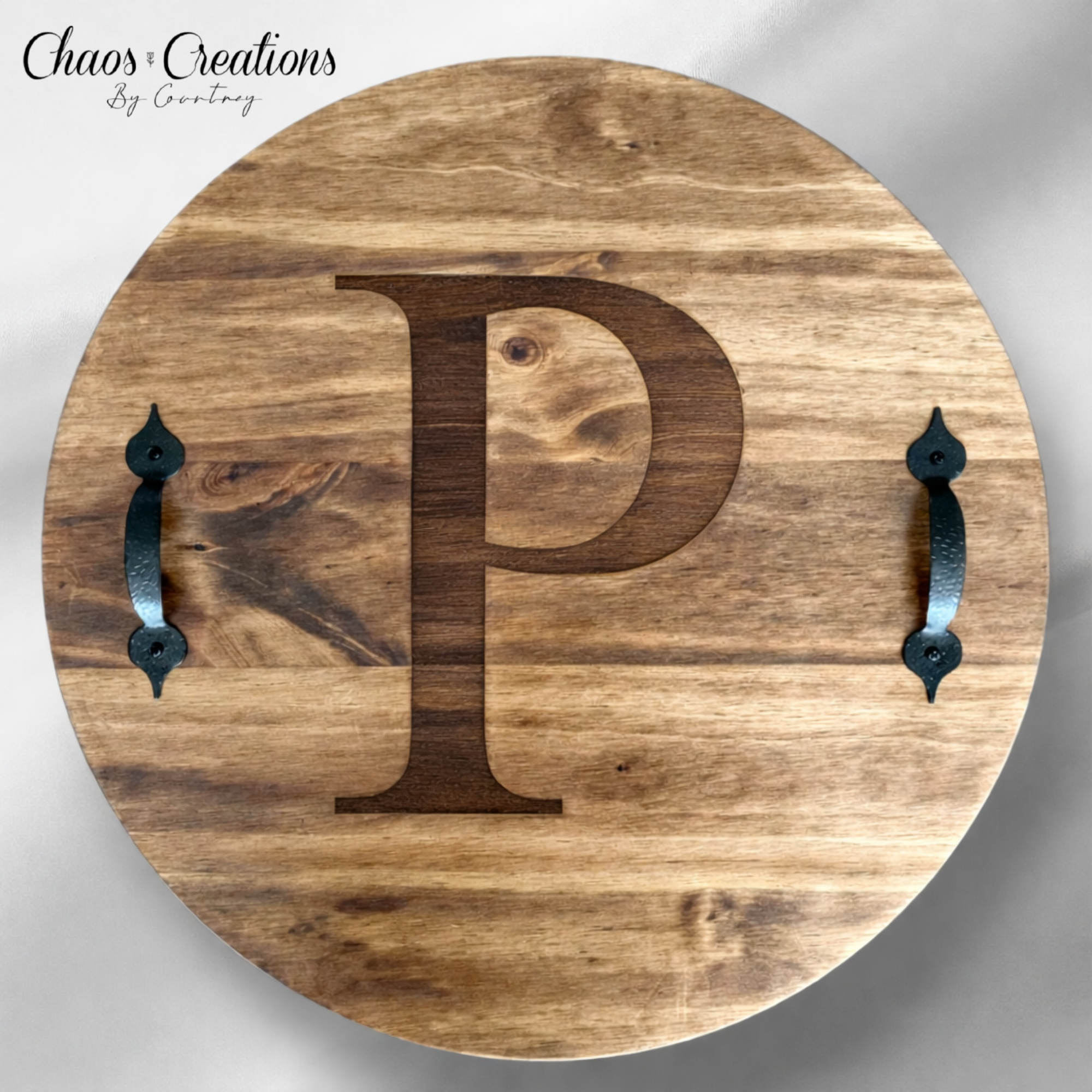 Handcrafted engraved wood serving tray, sanded, stained, and sealed for a durable, high-end finish. Personalized with your custom monogram or design.